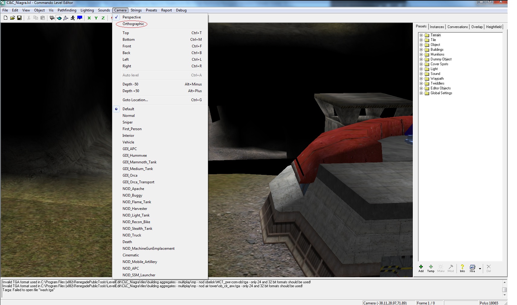 Blacky Posted January 26, 2017 Posted January 26, 2017 This is a quick Guide on how to make Map Overview Images. Could be used in a custom hud. If you make map overview images please share. Requirements: A proper installation of Renegade. if you don't have the correct registry entry's for renegade leveledit wont work. Renegade Public Tools ( Contains LevelEdit ) Renegade Public Tools 2 LevelRedit ( Convert Mix Files into .lvl Files ) LevelRedit Leveledit Dev. A special version of leveledit that has the Orthographic camera view. Leveledit_Dev.zip 1. Find the mix file of the map you want to create a map overview for and convert it into a .lvl file with LevelRedit. 2. Install Leveledit_Dev.exe in your leveledit folder. Default path C:\Program Files (x86)\RenegadePublicTools\LevelEdit\ 3. Run Leveledit_Dev.exe and open the map .lvl file you just created in leveledit. 4. Select Instances and Uncheck the editor objects circled. 5. Select Orthographic Camera View 6. If you have any black parts or it looks weird. Solve the lighting. 7. Take a Screenshot and crop it to your needs. If using if for a hud you will most likely need to have matching constraints like 512 X 512 Image ( unlike my image ) This was a quick and dirty guide. Hope it was helpful. 3