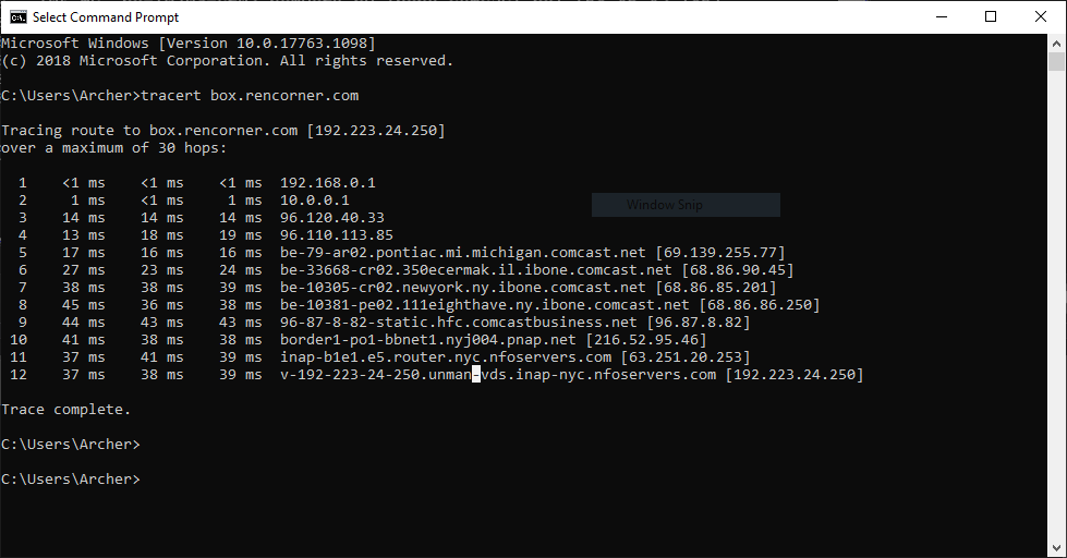 YesNoMayb Posted March 27, 2020 Posted March 27, 2020 C:\Users\micha>tracert box.rencorner.co Tracing route to box.rencorner.co [192.223.24.250] over a maximum of 30 hops: 1 10 ms 12 ms 11 ms Fios_Quantum_Gateway.fios-router.home [192.168.1.1] 2 16 ms 9 ms 6 ms v-192-223-24-250.unman-vds.inap-nyc.nfoservers.com [192.223.24.250] Trace complete.