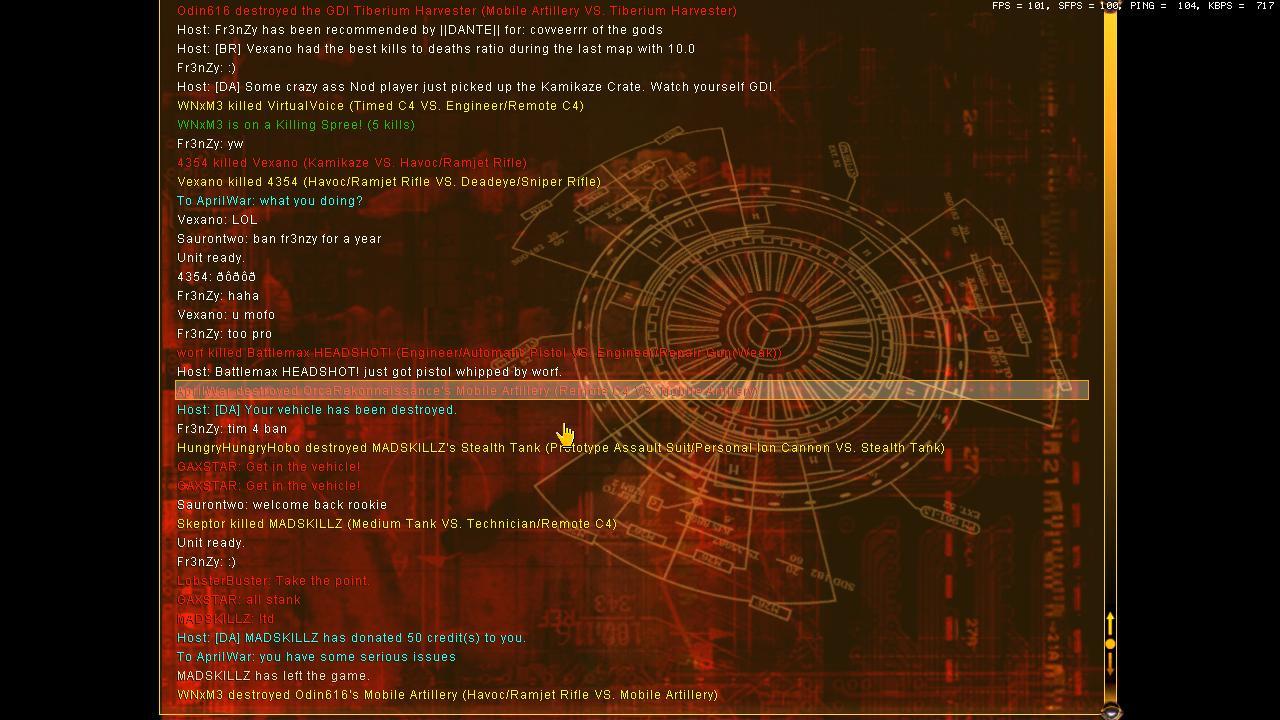 0rcaRecon Posted December 16, 2023 Author Posted December 16, 2023 Unbelievable how he totally changed the narrative. He is making it out as if I left the arty in the middle to go into ref, and he blew it up to stop anyone from GDI from taking it. No, it was at the time I came back from HON back side back to the middle of base and he started shooting my arty with his stank while the C4 was already on my arty which he had put on from HON area. As soon as I get out to repair he blows it up. (Arty had half HP so needed repairing but I actually got out because I knew he would blow it up so took a screenshot.) He said I did nothing to defend againt becaon, yet the screenshot below shows that I died while trying to disarm it. What was I doing at HON??? When he said I did nothing to help. I have plenty more sceenshots. Also this Aprilwar is the one who lost his stank to the guy who Ion beaconed; he took it from Aprilwar (it's in your server logs and also on my screenshots). Fr3nzy, the guy who Ion beaconed, killed me with this stank when I was trying to disarm. Screenshot shows that I am Rocket Soldier with Repair gun. And he didn't want GDI to get their hands on Nod tanks, the hypocrisy of this guy... I am seeing that there is absolutely no reasoning with this guy.