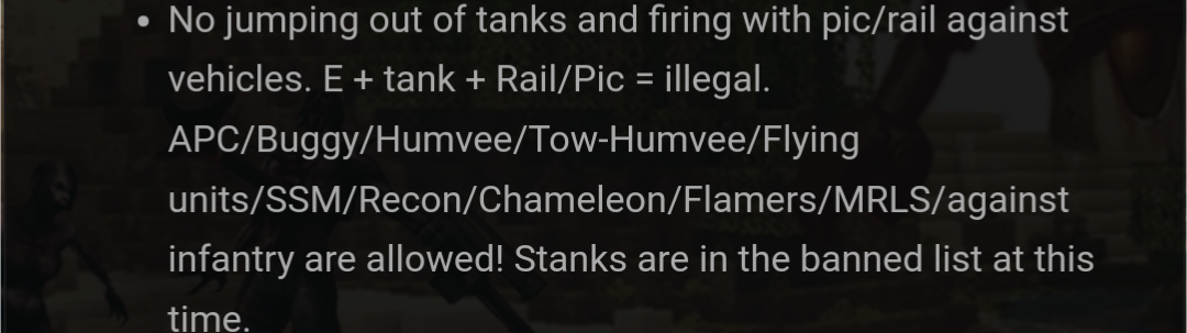 Manuel857 Posted December 26, 2022 Posted December 26, 2022 I guess shaitan's wording is confusing to understand. But APCS/ Buggys/ etc + rail/pic is allowed. Its the Double shoooting like Arties/meds/lights + rail/pic that isnt allowed. As for for flaming vehicles, we have the rule there. You can only put remotes on your vehicle if SBH/enemy steals it. Not allowed to spam remotes and rush to enemy and destroy it.